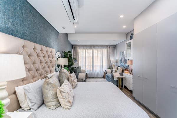 The unit features a stylish en-suite bathroom with an extra-large walk-in shower and is sold inclusive of air-conditioning, fixed cupboards, and sunscreen blinds.