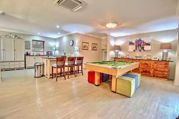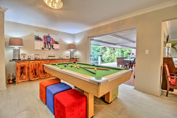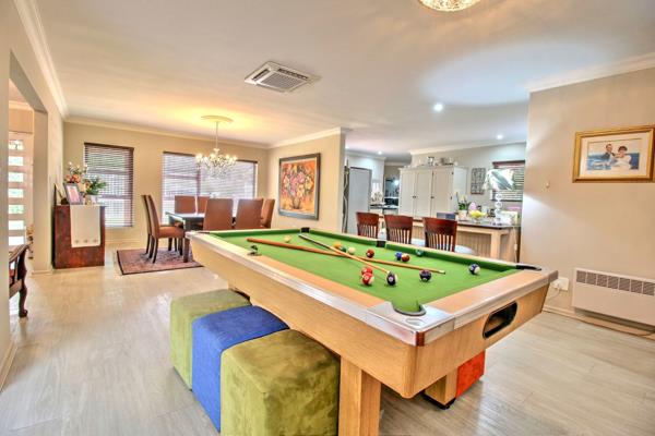 The open-plan layout connects the lounge, dining area, poolgames space, and kitchen, creating seamless indoor-outdoor flow to the covered deck and swimming pool.