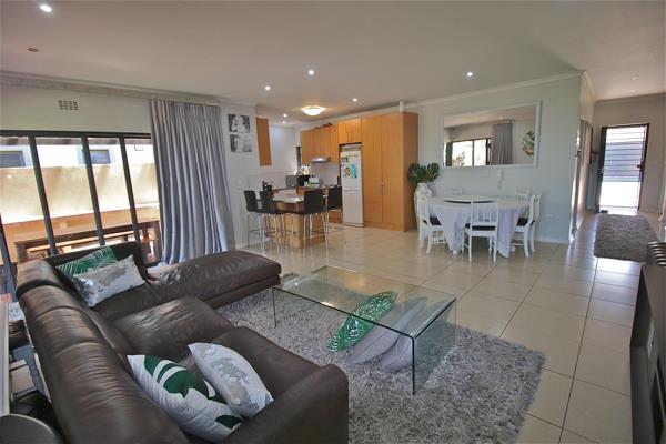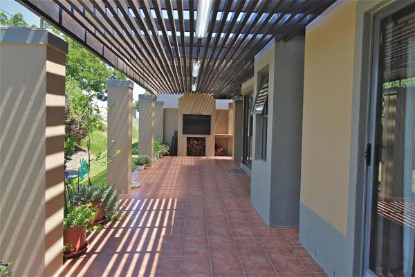 The entrance foyer leading to the spacious open plan tiled living areas open into an open plan lounge, dining room and kitchen with seamless flow to a covered entertainment deck with built in braai, sheltered from the wind and surrounded by a beautiful established garden. Enjoy the peaceful space surrounded by friends and family, enjoying braais, cocktails and breath taking sunsets in this magnificent secure setting in the esteemed Kleinmeer Estate.