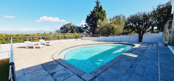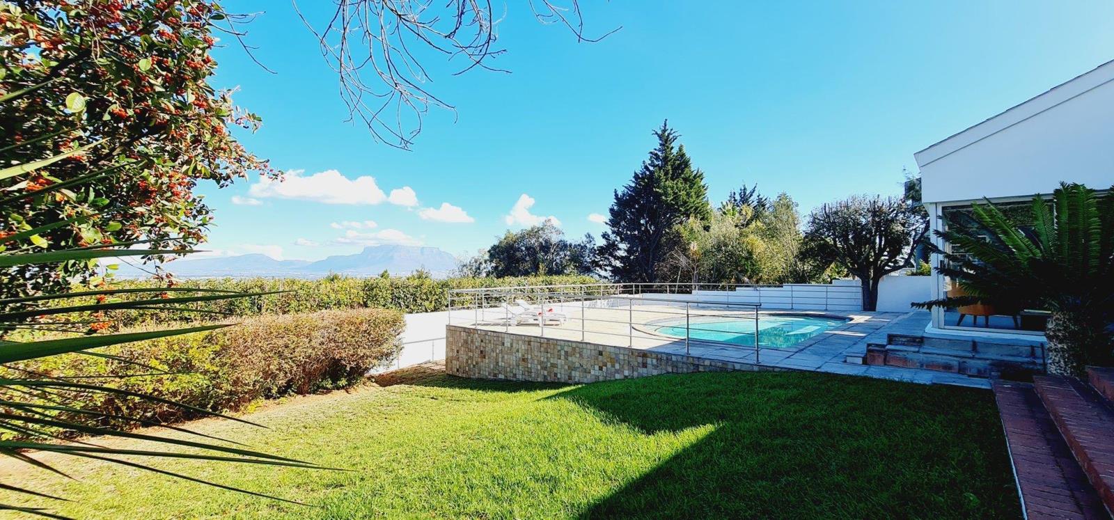 This exquisite, one-of-a-kind six-bedroom residence offers breathtaking panoramic views of Table Mountain and the sea. Situated on an expansive plot, High up in Plattekloof, it features two distinct dwellings and four garages, making it perfect for dual-family living or rental income opportunities like Airbnb.