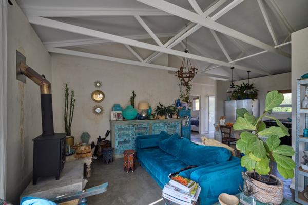 The heart of the home is the spacious, double-volume open-plan lounge, dining, and kitchen area. The kitchen is designed for convenience, featuring cement counters, an electric oven, gas hob, double sink, and space for a double fridge. It is plumbed for both dishwasher and washing machine, with cupboards to be added before registration.
