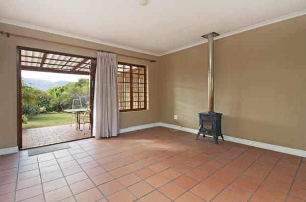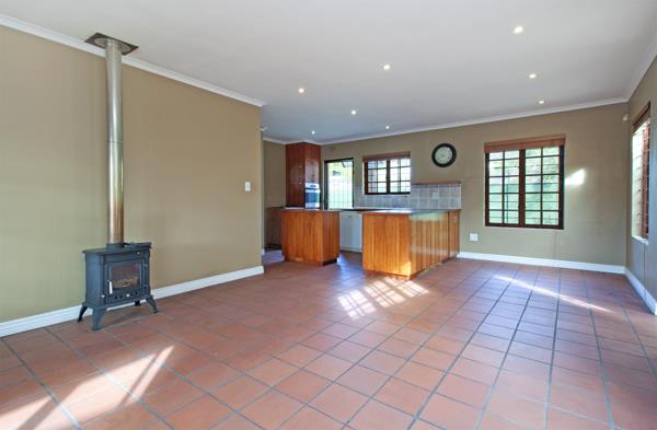 Flowing seamlessly from the kitchen, the dining room and lounge area offers a cozy, homely feel. A closed fireplace promises snug winter evenings, while French doors lead out to a covered patio-a lovely spot to enjoy your morning coffee while looking out over the garden.