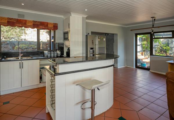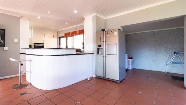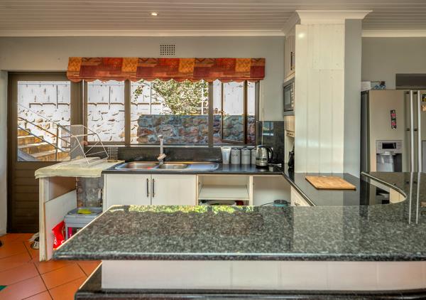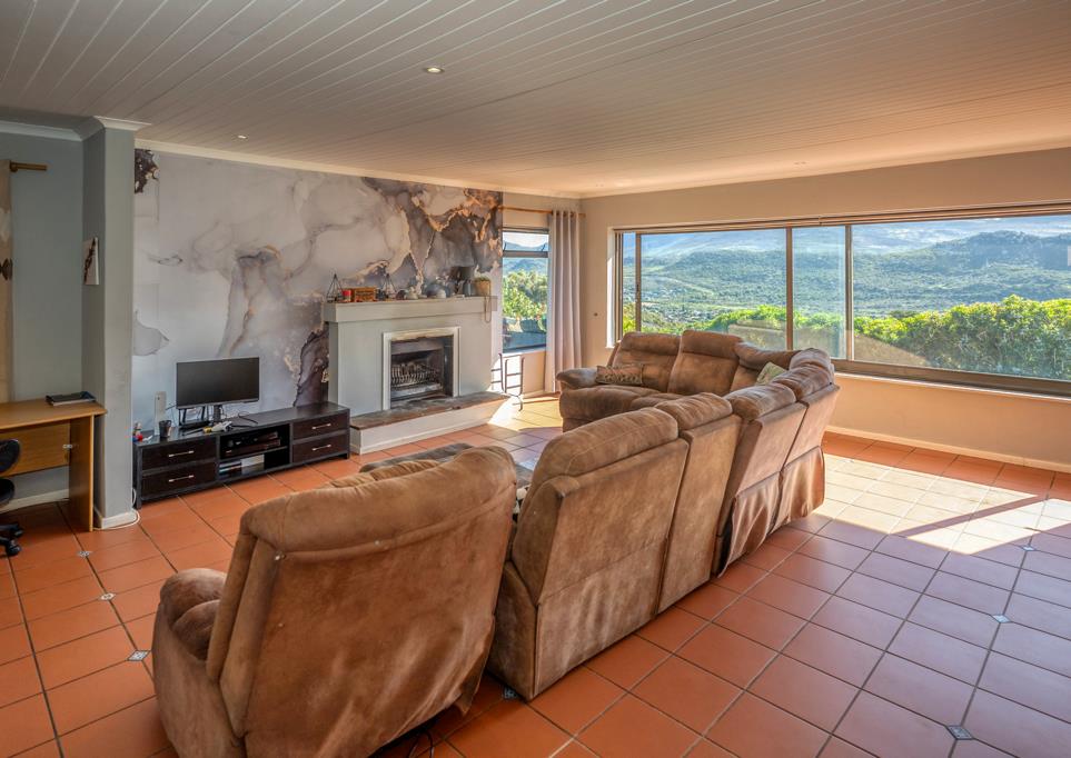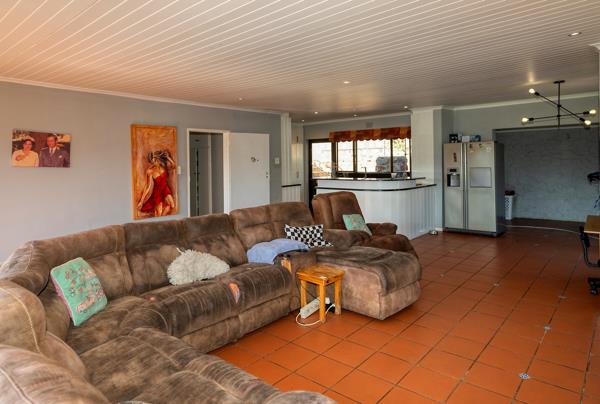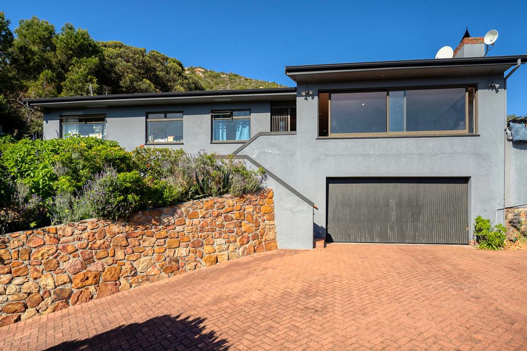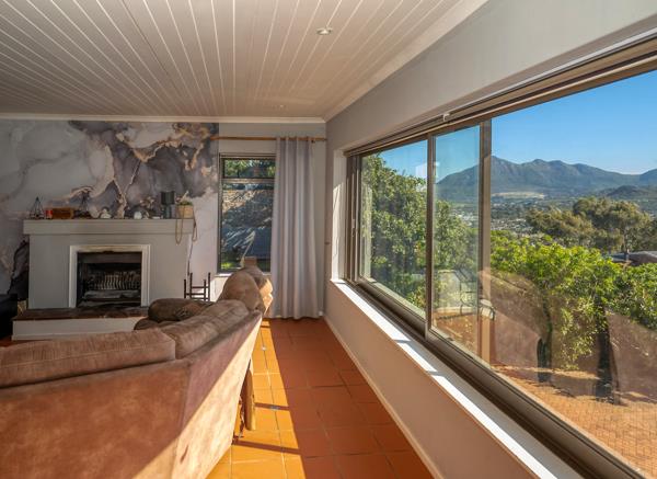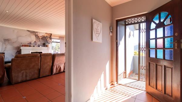 The living space features a fitted kitchen, open plan living with large lounge and dining area plus fireplace and huge aluminium sliding windows, offering panoramic views over Clovelly Mountain and towards the west. From here access is provided to a sheltered garden space with lapa and seating area, perfect for those braai days.
