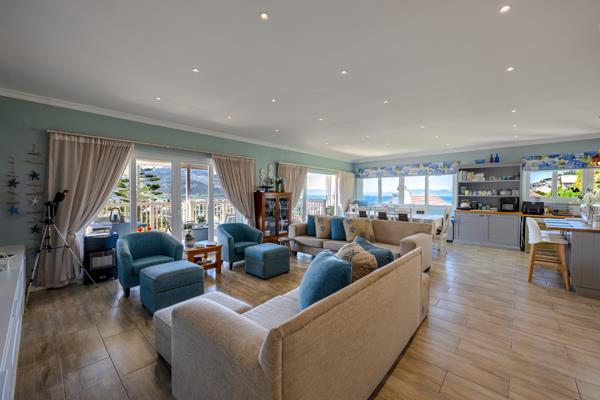 Set across 2 levels, the main house takes up the entire top floor of the property, opening from the entrance stairway onto an expansive open-plan lounge dining kitchen area, with direct views of False Bay. The flow of this exquisite space is seamless, allowing for a multi-functional configuration of living areas. The valley-facing frontage opens onto a full-length, extra-wide balcony - perfect for lounging or entertaining - and it houses a large built-in braai. The intentional configuration means that this space is wind-sheltered, while still allowing perfect views of the valley, as well as the ocean and mountain ranges beyond.