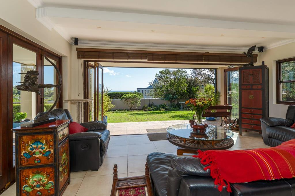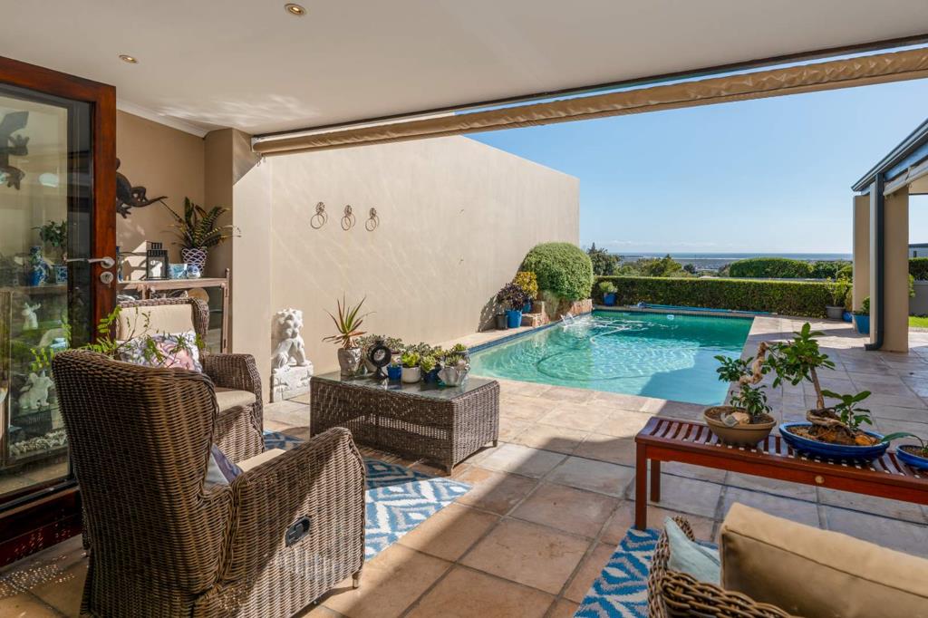 The dining room and lounge open onto the pool with a covered patio and drop-down blinds for the afternoon sun in summer and the rainy and cold weather in winter.