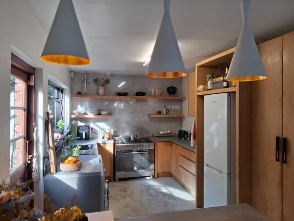 The spacious open plan lounge, dining & kitchen area opens to an enclosed patio, perfect for entertaining, featuring a fireplace & screeded floors. The modern kitchen has wooden cupboard doors, floating shelves, stone countertops, and an island.