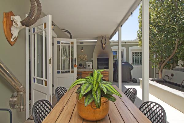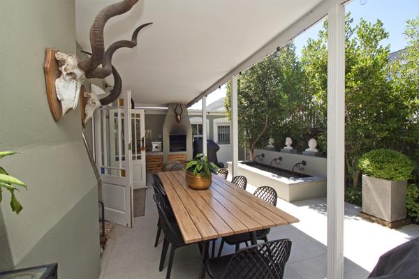 One of the homes defining features is its exceptional outdoor living. A north-facing front patio is light-filled, open and inviting, perfect for morning coffee, winter sunshine and relaxed entertaining. In contrast, the back patio offers a completely different mood: private, sheltered and immersed in lush, established greenery. This secluded space is enhanced by a tranquil water feature, a built-in braai and a garden that has been lovingly nurtured into a thriving sanctuary, alive with birds, bees and butterflies. A small garden firepit completes the picture, ideal for evenings under star-filled skies and full moons.