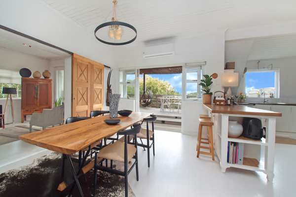 Upstairs, vaulted ceilings and abundant natural light highlight the open-plan kitchen with pantry, flowing into a dining and lounge area. Expansive glass doors open to an elevated deck that frames ocean glimpses and leafy surrounds, bringing Kommetjies natural beauty into your daily living.