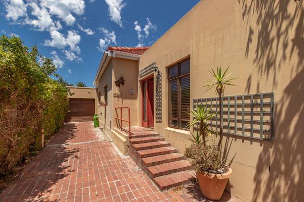 The home offers four well-sized bedrooms. The main bedroom features an en-suite with corner bath and separate shower, built-in cupboards, and doors opening to a private courtyard. The second bedroom includes built-in cupboards, a fireplace, and garden views, while the third bedroom also offers built-in cupboards. The fourth bedroom doubles perfectly as a home office.