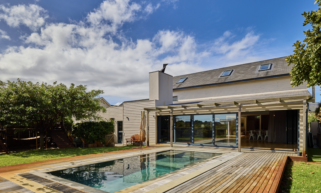 Stacking and sliding doors open to the private, established garden with a jungle gym and a sparkling pool, featuring a safety cover, salt chlorinator, and electric heating system ideal for indoor/outdoor summer living and entertaining.