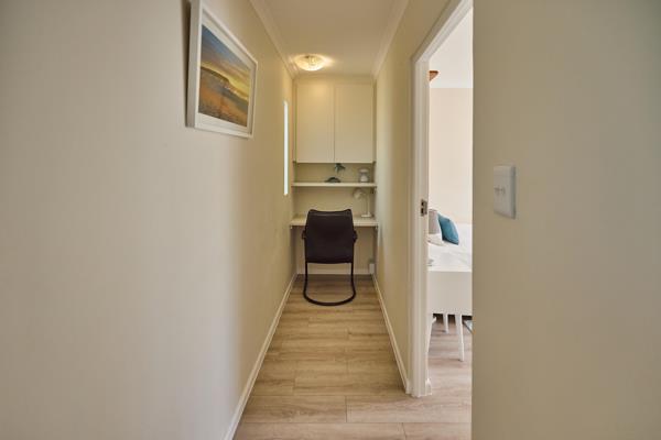Continuing down the hallway, youll discover a charming alcove complete with a built-in bookshelf and a handy laundry cupboard. Two additional sunlit bedrooms branch off from here, each with large windows and built-in cupboards. At the hallways end, a built-in desk creates a perfect home office nook, accompanied by a compact storage cupboard for added functionality.