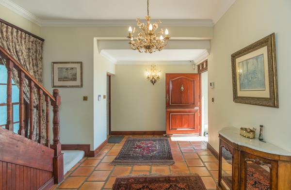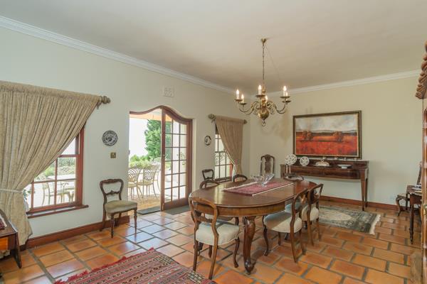 The lower level offers flexible living and entertainment space. A fourth bedroom, currently used as a large office, is serviced by a guest bathroom. The lounge features a working fireplace and leads into a separate dining room. The kitchen is designed on a large scale, with a country-style aesthetic and space for a 10-seater dining table, additional lounge area with fireplace, and direct access to a scullery with two appliance connections and ample storage.