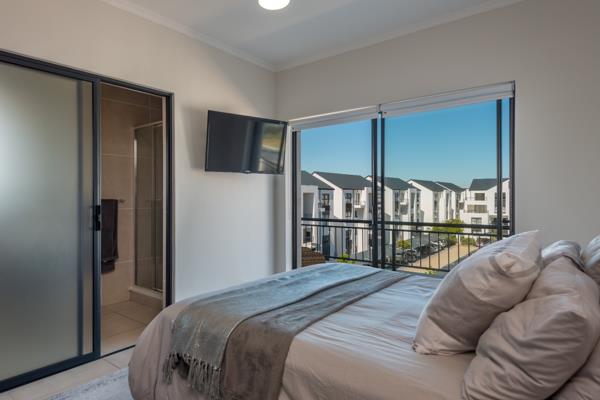 This top floor 2-bedroom apartment is situated close to the estate clubhouse and the golf course. The unit has a spacious living and dining room area which leads into an open plan kitchen. The kitchen has neat cabinets with ceaser stone tops and includes a fridge, washing machine and tumble dryer. The lounge opens via sliding doors to a large balcony where you can enjoy beautiful golf course and mountain views. The main bedroom includes built in cupboards with an en-suite bathroom and has access to the balcony. The 2nd bedroom is also very spacious with built in cupboards. This room has access to a full bathroom which includes shower and bath.