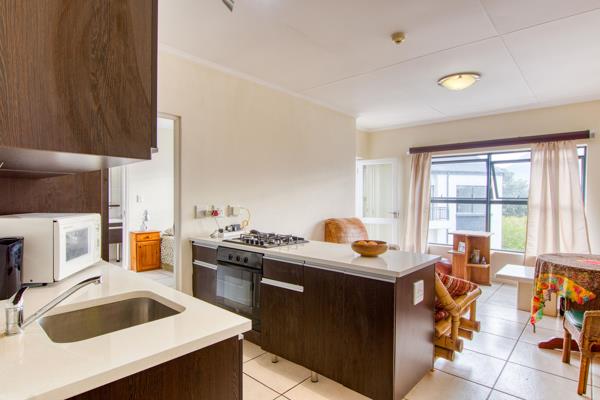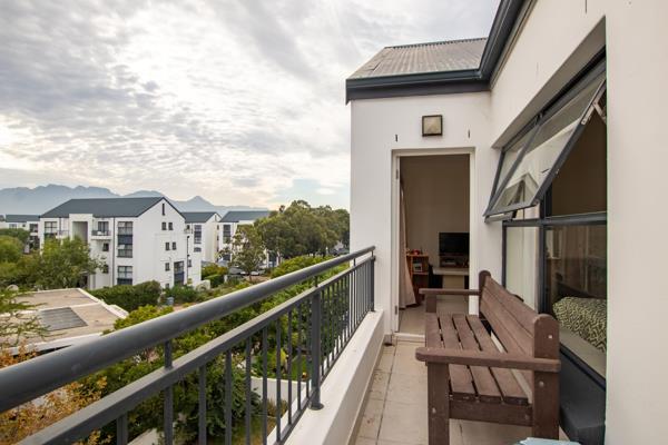 This top-floor apartment offers a spacious 1-bedroom with built-in cupboards and a modern en-suite bathroom. The contemporary kitchen, fitted with a gas hob, flows seamlessly into the open-plan living area, leading out onto a private balcony with beautiful views.