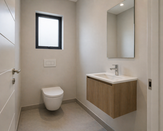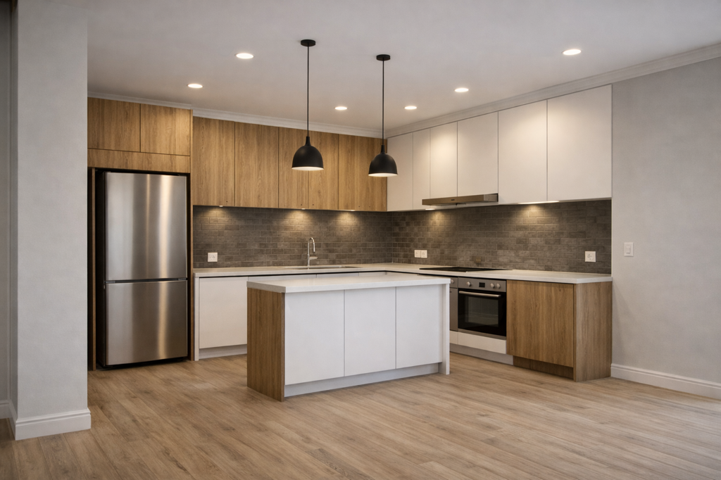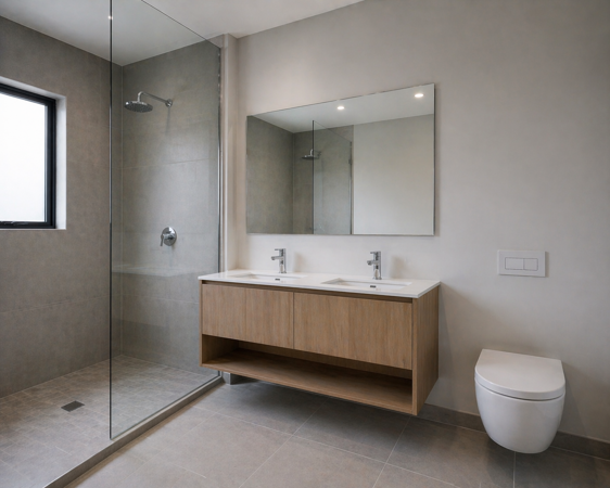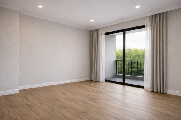 The ground floor features a spacious open-plan layout, seamlessly connecting the kitchen, dining, and lounge areas. The contemporary kitchen is finished in clean, neutral tones with wood accents, creating a warm yet modern aesthetic. Large sliding doors open onto a covered patio and private garden, ideal for relaxed outdoor living and entertaining.