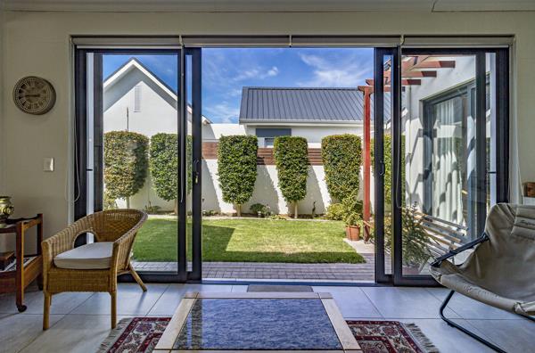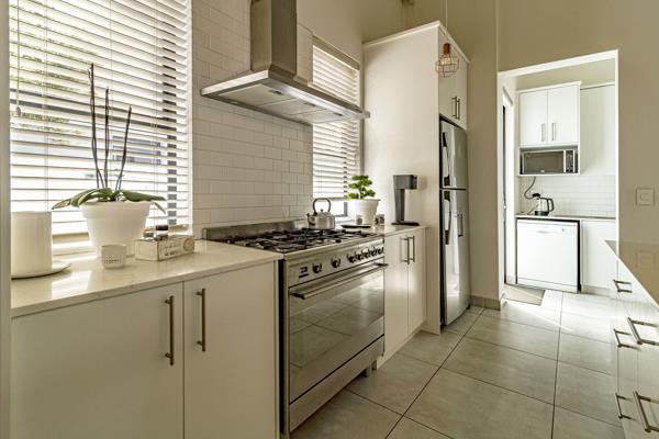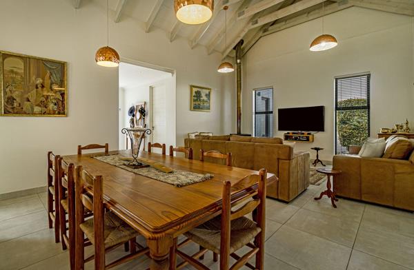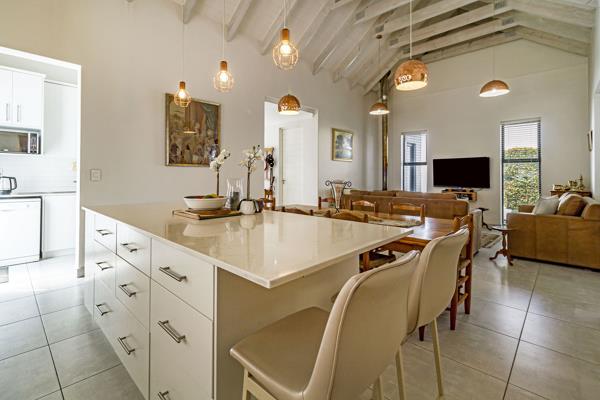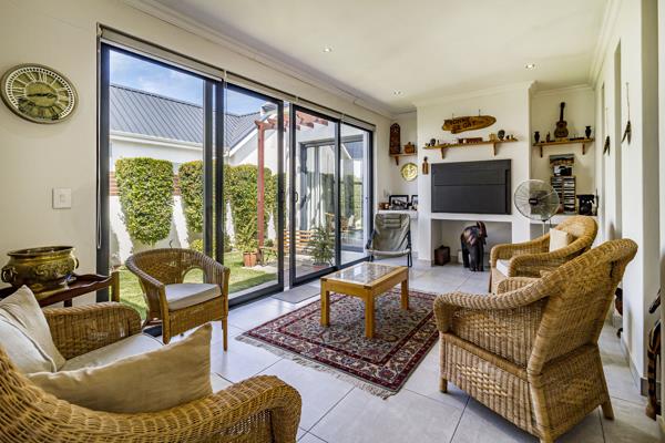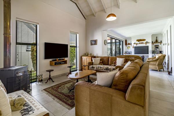 The north-facing braai room is perfect for year-round entertaining, featuring a built-in braai and sliding doors that open onto the beautifully landscaped, low-maintenance garden, creating a calm and effortless indooroutdoor lifestyle. A closed-combustion fireplace with exposed flue adds cosy warmth and ambience to the living area during cooler months.