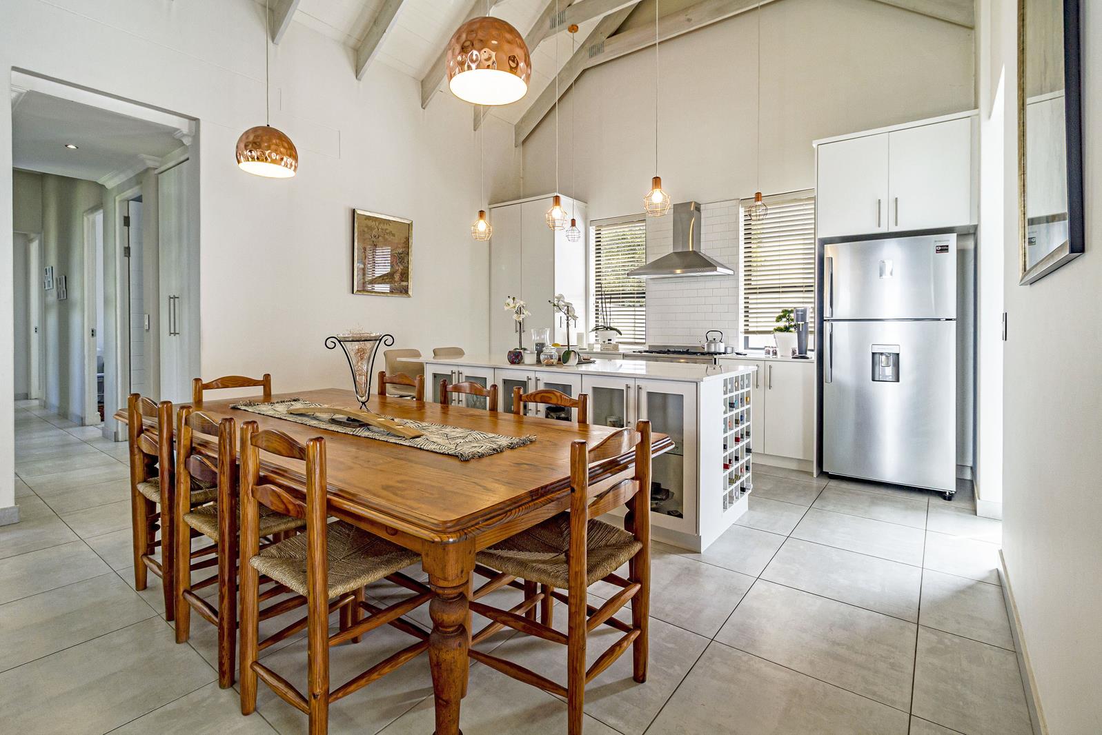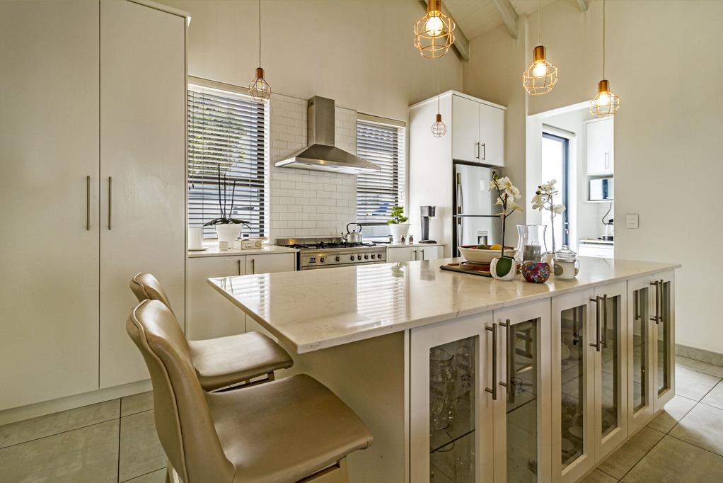 Step into light-filled, open-plan living with exposed trusses and a gentle, seamless flow between the lounge, dining area, braai room and kitchen. The modern kitchen offers ample cupboard space, a gas hob, electric oven, extractor, and a generous centre island with extensive storage cupboards. A separate scullery provides additional cabinetry and space for three appliances, while the outdoor washing area includes a convenient trough.
