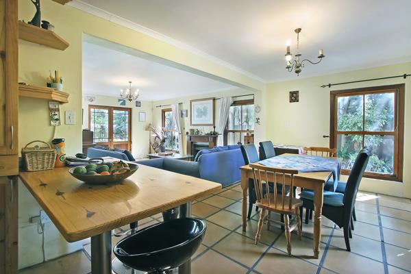 Tiled open plan lounge/diningroom with wood burning fireplace and sash windows. 2 sets of wooden double doors open up to front garden and another set opens up to the side garden. Tiled study/4th bedroom with toilet.