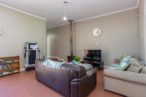 The kitchen forms part of the open-plan layout and features a central island with a prep bowl and a free standing Smeg gas hoboven. It is plumbed for a dishwasher and opens onto a small outside area, perfect to create a pretty courtyard. A laundry room leads off this courtyard. The lounge has a free standing fireplace and the dining area houses a large table and chairs.