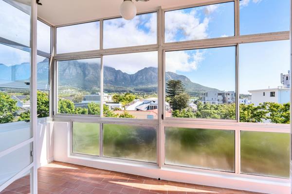 The generous living and dining area extends onto a balcony offering incredible mountain views and looks over the leafy suburb below.