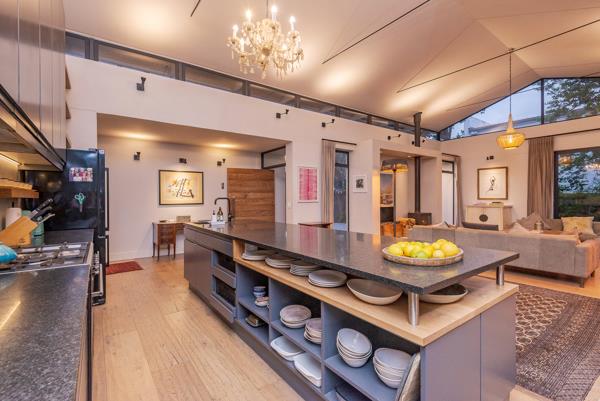 Central spacious open plan dining space with stacking doors on either side flowing to decked outside entertainment area and swimming pool.
