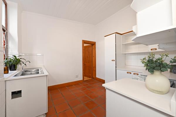 A neat and functional kitchen includes a freestanding oven and is plumbed for one appliance.