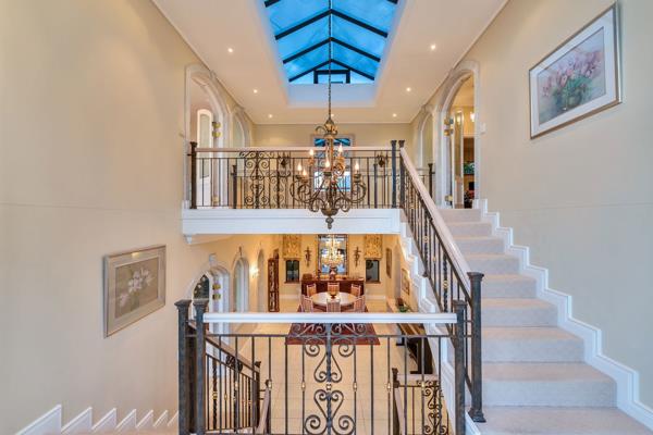 The 1st floor level boasts a generous open-plan living area that flows seamlessly onto a covered veranda & swimming poolideal for both relaxed family-living & entertaining. The kitchen features a gas stove & provides direct access to practical service areas, including a washing line, geyser room/ storeroom, along with an external toilet. A formal lounge with high ceilings & a gas fireplace captures breath-taking mountain views, while the adjacent formal dining room is framed by a dramatic chandelier & elevated on the central double-volume landing.