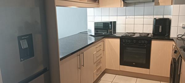 Boasting a fully-fitted, modern, tiled kitchen equipped with a built-in oven and hob, granite tops, and convenient plumbing for two appliances. A large, light and airy lounge, with exquisite flooring, flows effortlessly to a massive balcony, accessed via sliding doors. The balcony is almost a private mezzanine in size and added value, with space entertainment, reflection or enjoying the view.