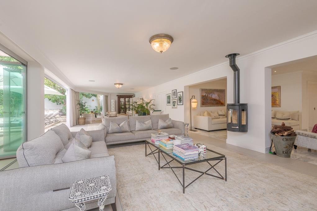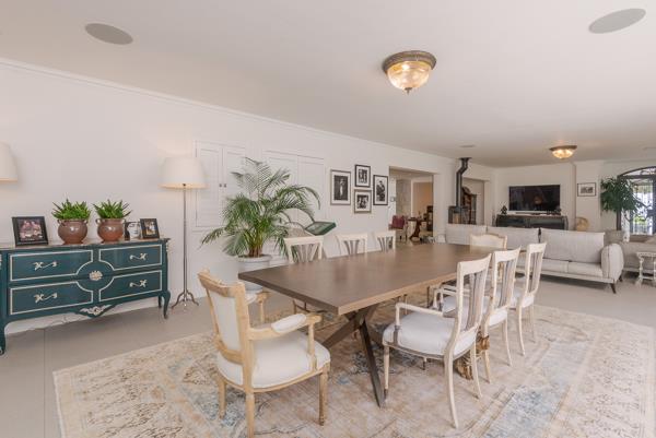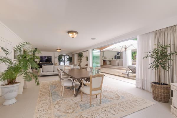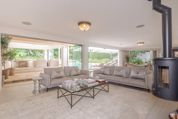 Designed for both grand entertaining and relaxed family living, the home boasts ultra-chic reception areas with seamless flow. A bespoke bar and formal lounge, complete with a striking wood-burning fireplace, transitions effortlessly into a casual lounge and entertainers dining area, anchored by a second feature fireplace. Ceiling-to-floor glass stacker doors invite natural light and open onto an elegant alfresco indoor/outdoor entertainment room. This space, framed by big picture windows and glass stackers, is perfectly appointed with a Modi wall-mounted stainless steel braai and a premium Italian Alpha pizza oven, setting the scene for effortless entertaining.