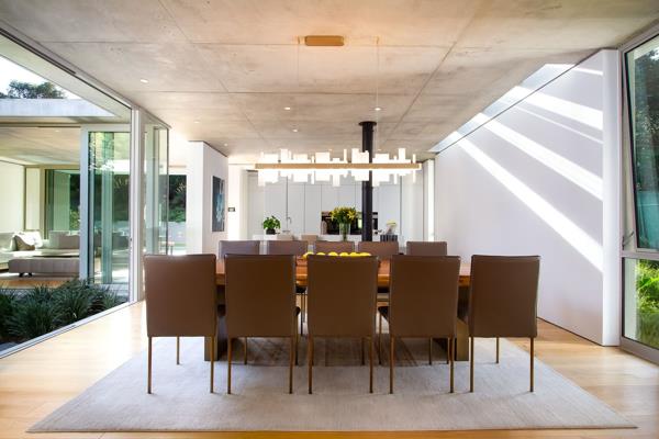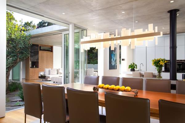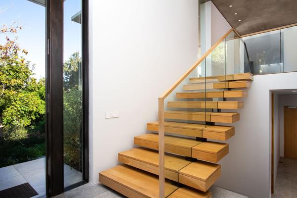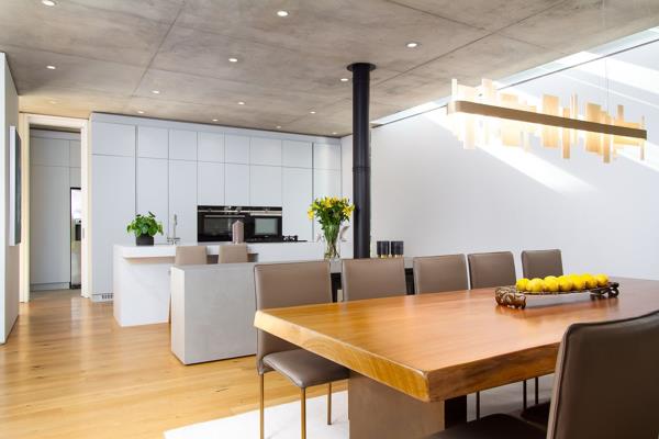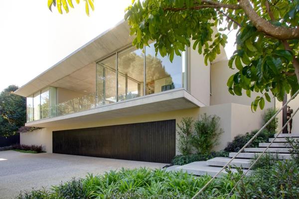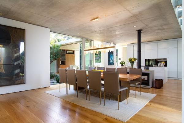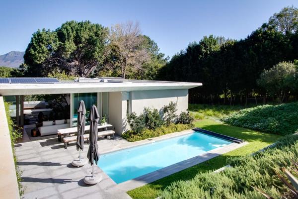 This contemporary Award Winning home is a masterful synergy of easy indoor-outdoor living, modernist minimalism and magnificent Cape surroundings. The design and execution of this exceptional property maximises its position. Suffused by natural light, the home sits on 1800m2 and is nestled organically amongst mature vegetation and a landscaped garden. The gentle flow creates an impression of living amongst and in harmony with the surrounding trees. Wood panelling, cleverly positioned stairs and artfully placed windows invite in the dappled light, rendering this beautiful home completely at one with it''s landscape. Minimalism and clean lines are complemented by a harmonious merging of concrete, glass, wood and natural stone elements, with high ceilings and double glazed glass throughout. Scorched wood panelling, using a unique Japanese wood burning technique, masterfully hides the garage doors, and creates the illusion of a dark wooden podium, with a light concrete structure buoyant above. A plethora of natural materials, in grand yet modest rooms, ensures complete symbiosis with the surroundings. The home showcases exposed concrete, oak and natural granite enhanced by the use of a gentle monochrome colour palette and is bathed in natural light from floor-to-ceiling glass and multiple skylights. An interior courtyard brings light to the front of the house, abutted on it''s Southern side by a traditional stoep or verandah. This offers distant mountain views in one direction and in the other, a view of the discreet swimming pool. The finishes and details of this genuinely unique and special home are refined and unobtrusive, subtle and rational. Quiet luxury, deferring always to the magnificence of its natural setting.