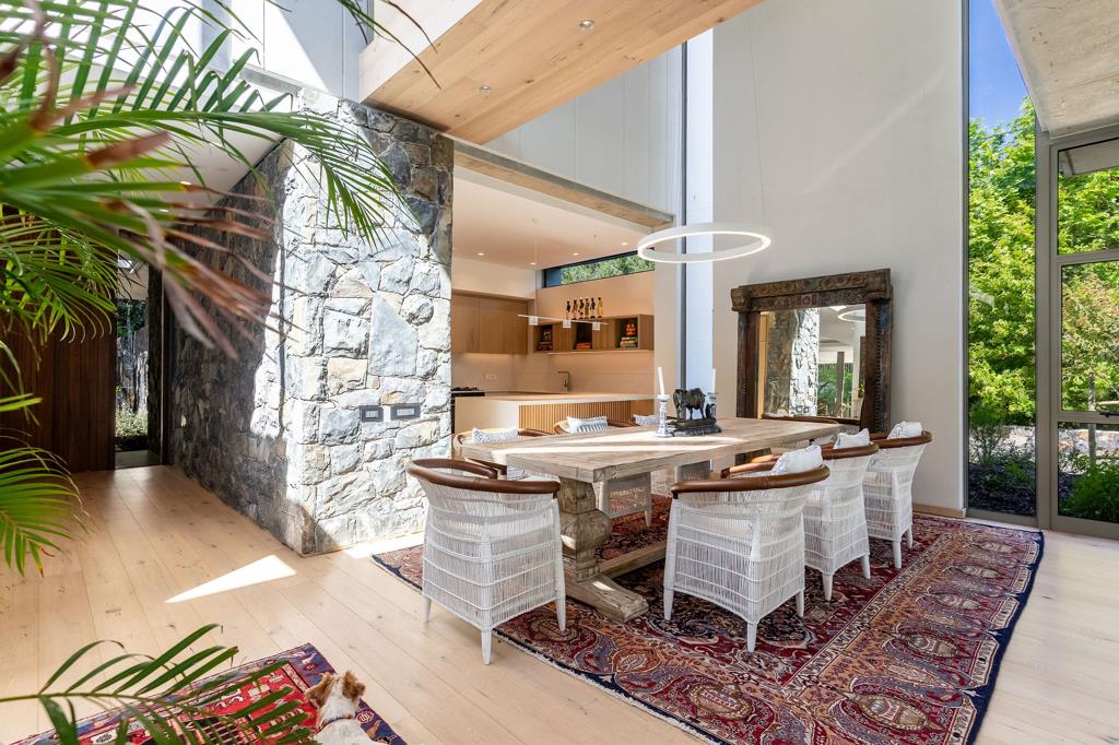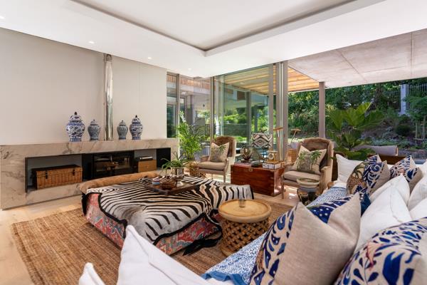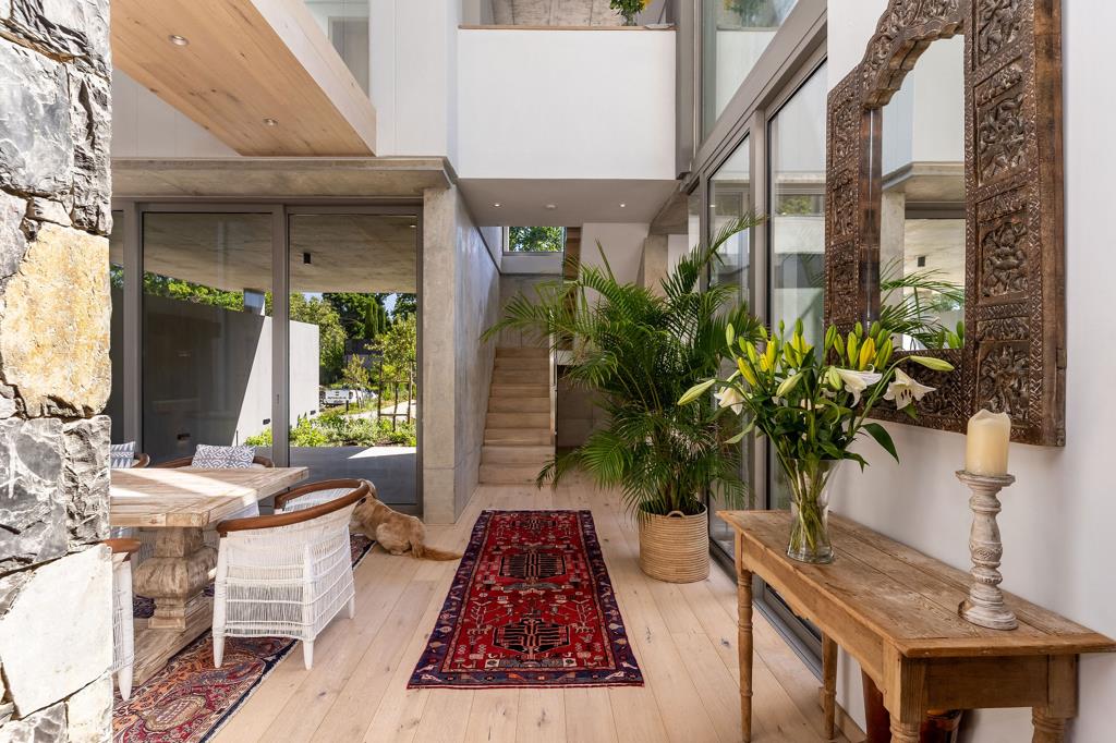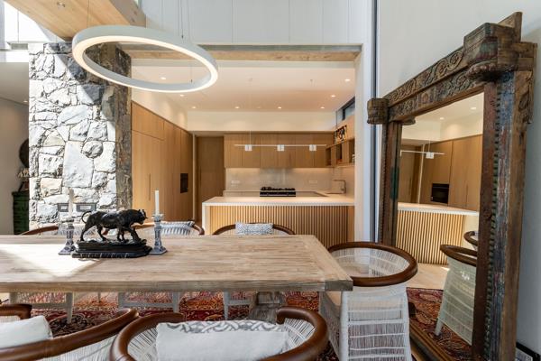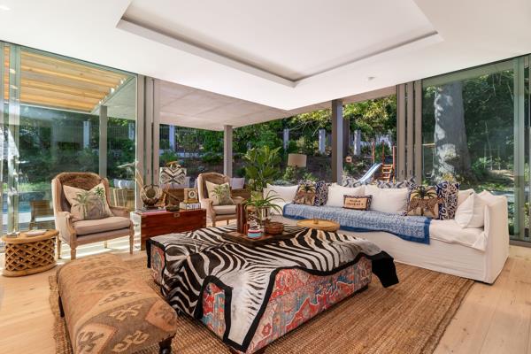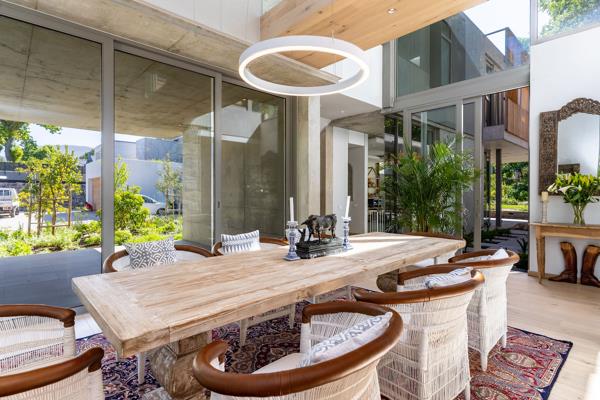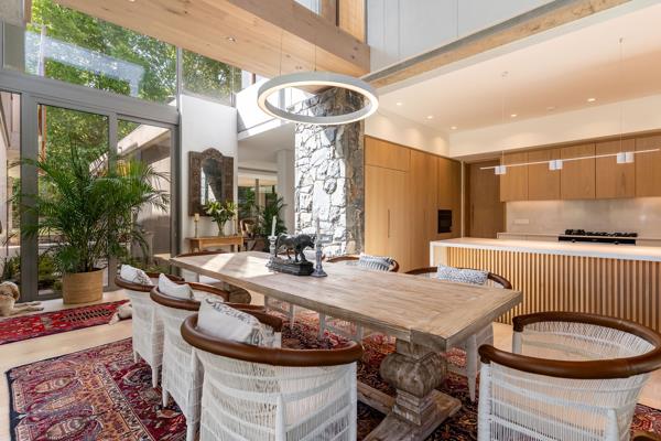 SOLE MANDATE | Luxury four-bedroom home in Botanica Constantia. Nearing completion. Centred around a mature oak tree, the entrance to ''Arca'' features expansive living and entertainment spaces. The living room, playroom, and double-volume dining room open onto a courtyard, creating a green space within the house. A central double-volume area, crossed by a bridge linking a study and pyjama lounge, brings in light and views from all sides. The dining room flows onto a covered patio with access to the established garden and pool area.