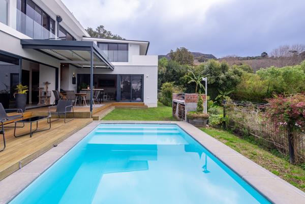 A contemporary yet warm four-bedroom home, where every bedroom enjoys its own private en-suite. The main suite is a serene retreat, with a walk-in dressing room and wrap-around balcony that drinks in the mountain panorama. Sunlit living and dining areas open to an elevated terrace with a solar-heated pool, fire pit, and built-in braai, perfect for long summer evenings.