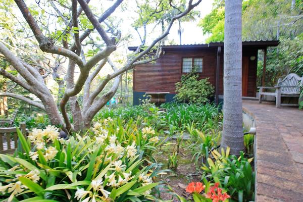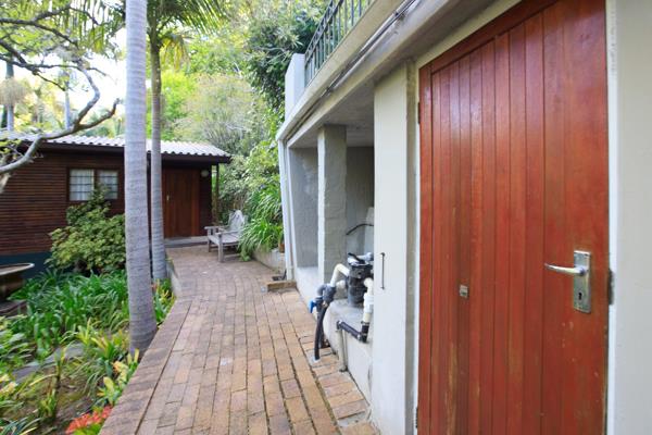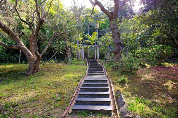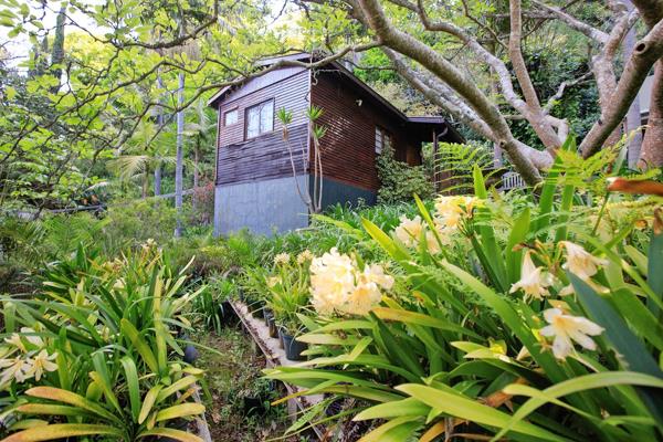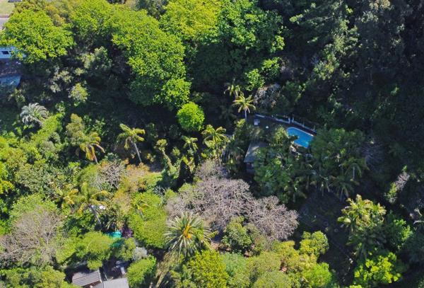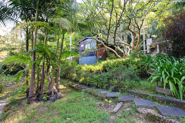 Discover an exceptional opportunity within the prestigious Constantia suburb of Cape Town. This expansive 8000 sqm erf offers a truly private and secluded natural environment, nestled amidst a heavily wooded, sloped mountainside. The property boasts stunning natural mountain views and a lush, mature garden with abundant trees and tropical foliage, creating a tranquil retreat from city life. Visible charming rustic structures are integrated into the landscape, hinting at a unique lifestyle or development potential.