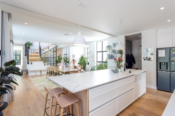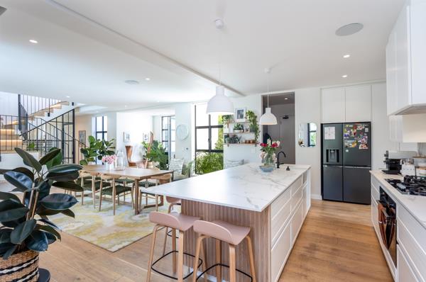 Open-plan living flows seamlessly from the bespoke designer kitchen through the dining and lounge spaces, out to the sun-kissed garden. A wood-burning fireplace warms the heart of the home, while stacking doors invite the outdoors in.