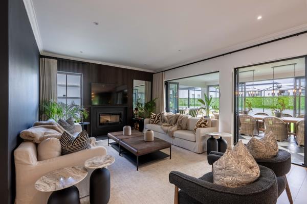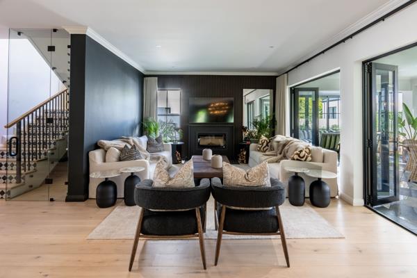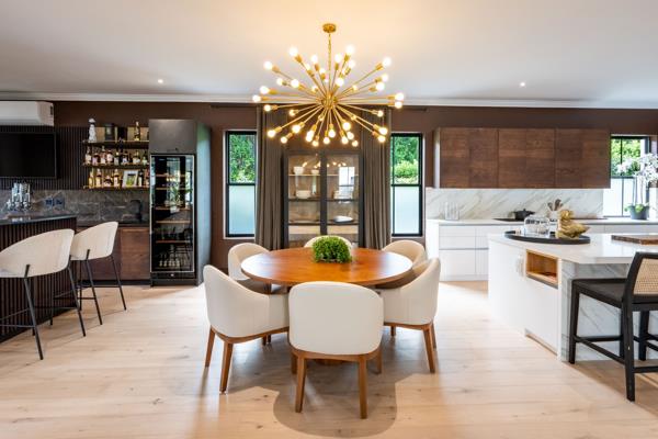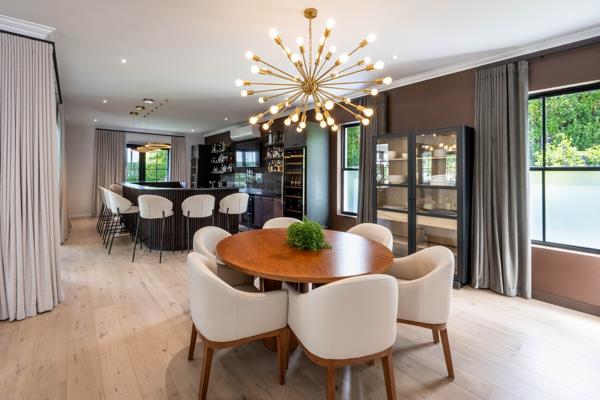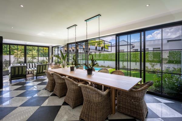 Designed for effortless family living and entertaining, the open-plan layout features a contemporary fireplace, seamless living and dining areas, and a gourmet kitchen with integrated appliances, separate scullery, and custom bar. A sun-filled, glass-enclosed patio opens onto a manicured garden and pool, creating a private indoor-outdoor retreat.