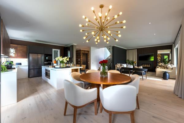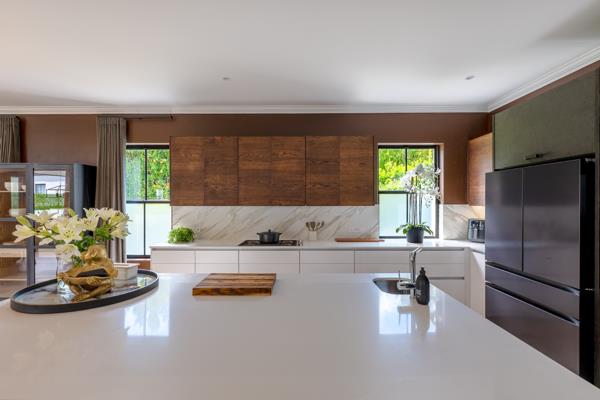 The interior has been thoughtfully designed for modern family living and effortless entertaining. Expansive open-plan living spaces flow seamlessly from the stylish lounge, anchored by a contemporary fireplace, through to the dining area and designer kitchen. The kitchen is superbly appointed with integrated appliances, a separate scullery with direct access from the double garage, and a bespoke bar that adds a distinctive touch for hosting and social gatherings.