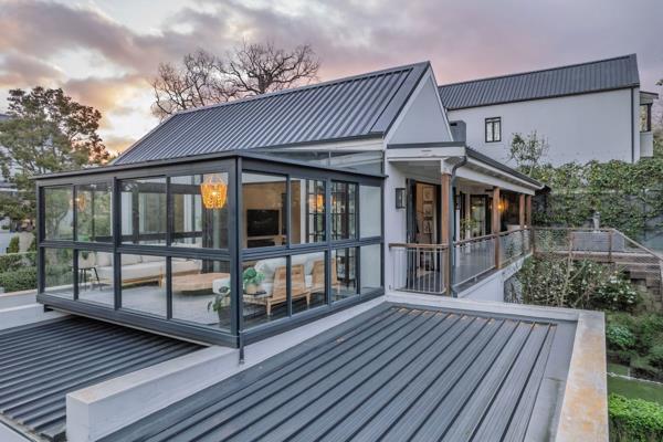 The open-plan reception rooms include a dining and TV/family room separated by a two-way fireplace, and entertainment room with built-in braai and access to a private undercover courtyard, ideal for alfresco dining. Multiple stack-back doors connect seamlessly to the pool deck, balconies, and a sun-filled glassed conservatory, ensuring year-round comfort and easy indoor-outdoor living. A versatile study or playroom adds flexibility, while bespoke finishes throughout include, aluminium door and window frames, American shutters, custom light fittings, engineered wood and tiled flooring, and exposed beam ceilings in the reception rooms.