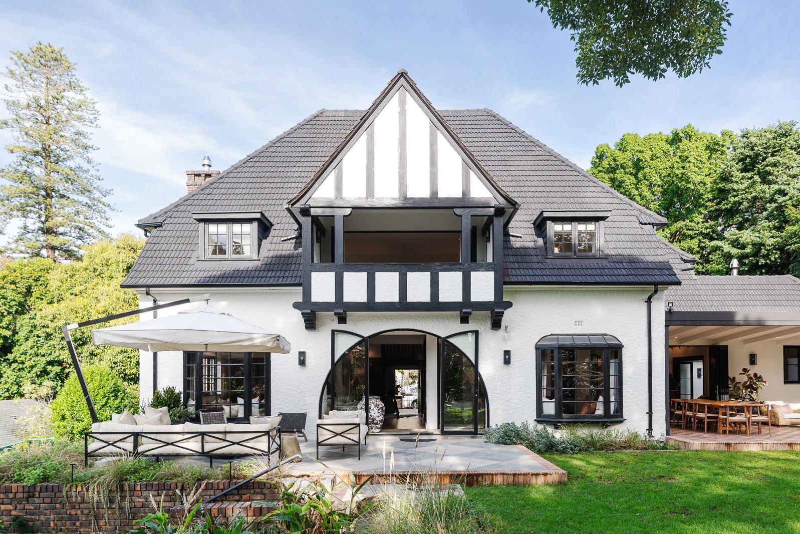 The open-plan lounge, kitchen, and dining areas are filled with light, thanks to thoughtfully opened interiors, decorative ironwork, bay and cottage-pane windows, and modern black aluminium sliding and large feature arched French doors that connect the inside with a landscaped garden. The garden itself is a retreat, featuring manicured hedges, a fishpond, rolling lawn, mature trees, and a swimming pool with heat pump.
