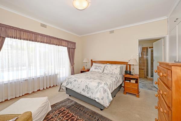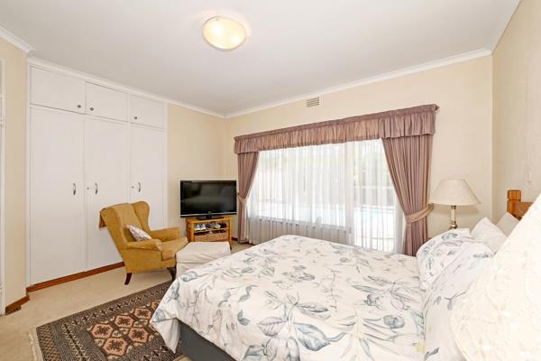 Accommodation includes three well-sized bedrooms, with the main bedroom featuring an en-suite bathroom and direct access to the garden and pool. The remaining two bedrooms are serviced by a neat family bathroom.