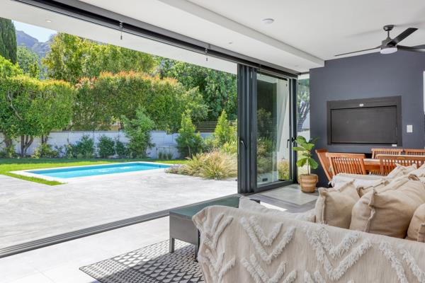 At the heart of the home is a designer kitchen that seamlessly blends form and function featuring premium finishes, integrated appliances, and a separate scullery and laundry for refined practicality. Expansive living and dining areas flow effortlessly onto the outdoor entertainment space, where glass doors open to a sparkling pool, manicured garden and magnificent mountain view ideal for relaxed gatherings or elegant entertaining.