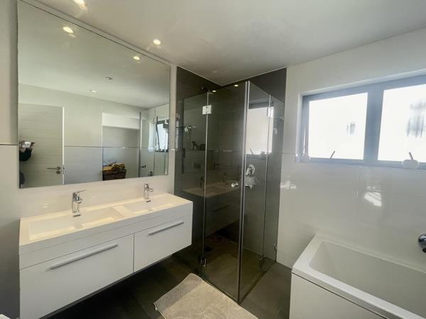 On the ground floor the open plan lounge, dining room and kitchen offer an easy flow to the outside courtyard garden and splash pool. The kitchen offers engineered stone countertops and a SMEG 750mm gas hob with 600mm electric oven. The living area is equipped with glass enclosed wood-burning fireplaces to create comfort and ambiance in the Cape Town winters. The first floor features a TV / pajama lounge which leads into the second principal en suite bedroom. Both of these rooms feature powder coated glass sliding aluminium doors that open to the north facing terrace. A compact home office / study is located off the upstairs landing. The two additional bedrooms share the family bathroom and both offer quality built-in cupboards. The expansive principal bedroom suite is located on the top floor and opens to an expansive patio and offers excellent views of table mountain.