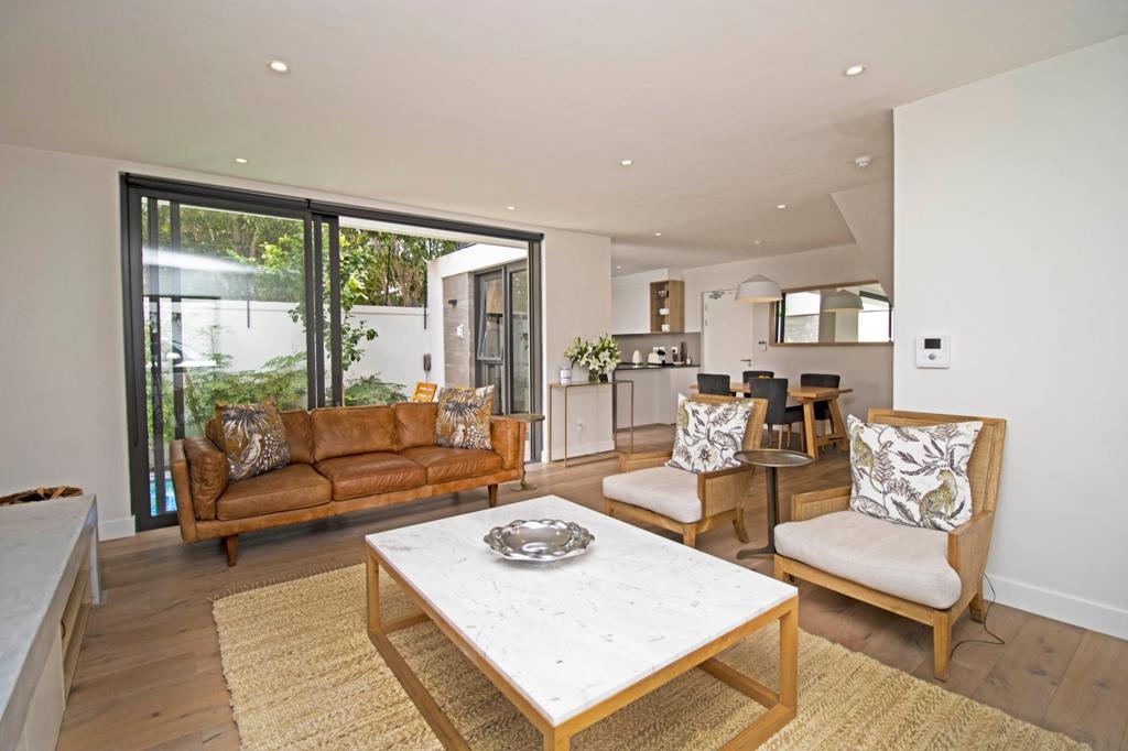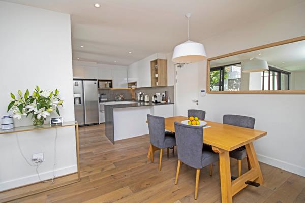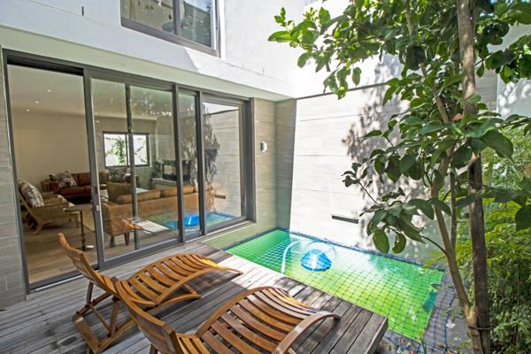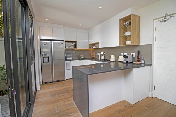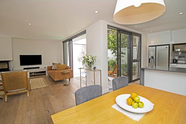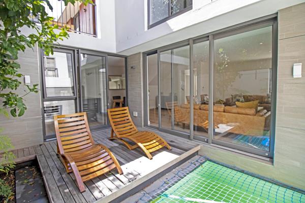 Kildare Place consists of a secure and exclusive niche estate of three urban homes in the leafy suburb of Newlands. The freehold title homes offer a stylish and contemporary take on the urban townhouse with the benefits of outdoor space, sunlight and views. On the ground floor the north facing courtyard garden and swimming pool flow out from the expansive open plan living area. The fully fitted kitchen with engineered stone countertops features sliding doors that overlook the courtyard garden and swimming pool.