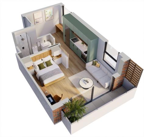 Each studio apartment is thoughtfully designed to feel warm, light, and spacious. Opt for the Premium finishes option to enjoy refined details like soft green or light grey kitchen cabinetry and built-in storage above the bed, touches that bring both style and function to your everyday living.