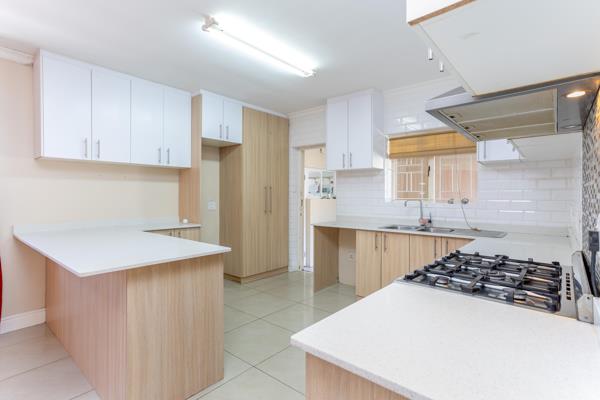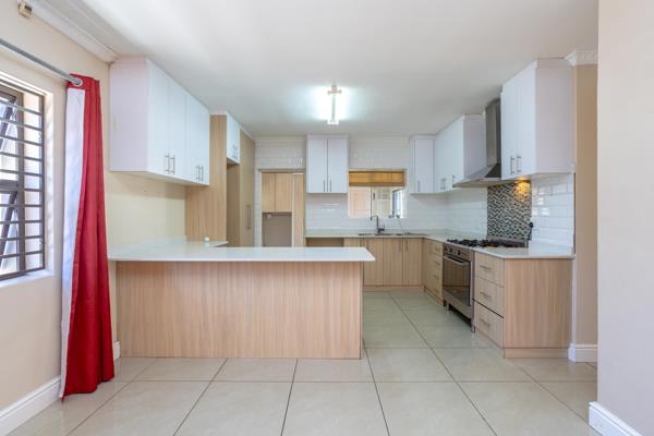 The property also boasts trellis doors, burglar bars, and vinyl flooring in certain areas, while the open-plan lounge and dining room area seamlessly connects to the back courtyard through inter-leading doors. The house has aluminium windows, a storeroom with a sliding door and plumbing point that leads to a double garage, and an electric gate with an intercom system for convenience and security.