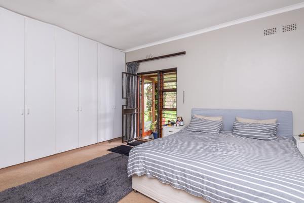 The main bedroom is extra-large, carpeted, and features abundant built-in cupboards, with doors opening to a beautiful garden. It includes an en-suite bathroom with a shower, toilet, and basin. There are two additional carpeted bedrooms, both with built-in cupboards, and a family bathroom with a shower over the bath, toilet, and basin.