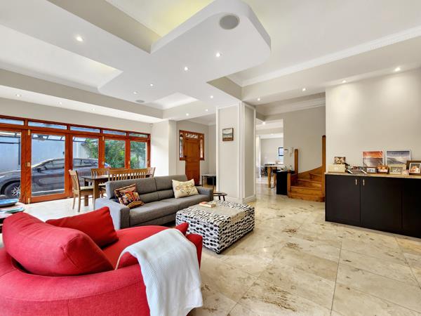 The dining area opens through stack doors onto a double carport, tiled in elegant travertine, which can double as an outdoor entertaining space. A separate formal lounge, also with pressed ceilings, original fireplace, and Oregon floors, provides additional space for relaxation or hosting guests. A guest cloakroom is conveniently located under the staircase, adding to the home''s practicality.