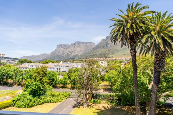 Inside, the well-designed kitchen flows into the open-plan living area, boasting classic wooden parquet flooring and north-facing views of Table Mountain.