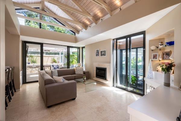 A standout feature is the enclosed conservatory with built-in braai, bar area, and water feature opening to the lush garden, pool, jacuzzi, and additional lawn space.