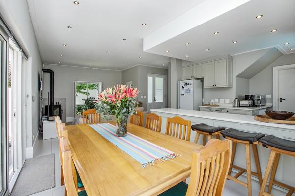 Upon entry, the open-plan interior seamlessly integrates the lounge, dining area, and a contemporary kitchen. Abundant natural light floods these spaces through expansive glass doors, enhancing the neutral colour palette and creating an airy ambiance. The modern kitchen features light cabinetry, pristine white countertops, an integrated hob, and a breakfast bar, ideal for both casual and formal entertaining. A stylish wood-burning fireplace adds warmth and character to the living area.