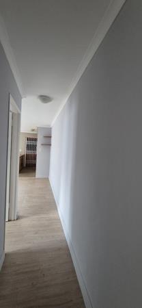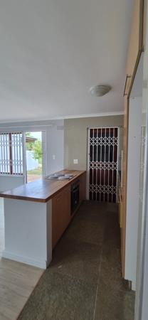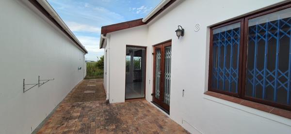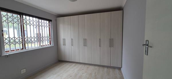 Two comfortable bedrooms maintain the neutral decor one includes a full wall of built-in wardrobes for ample storage. Security is paramount, with burglar bars, security gates on windows and doors, electric fencing, and an access gate ensuring peace of mind within this totally walled property.